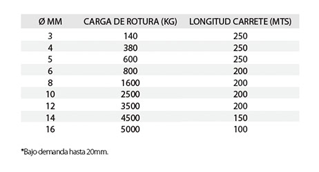 Construcción: doble trenzado / de 3 a 6mm: 16-husos 1:1 – 8 a 16mm; 32 husos 1:1.