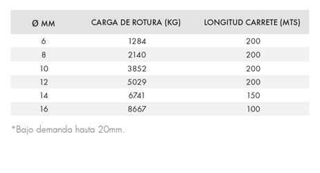 Construcción: doble trenzado / de 4 a 6mm: 16 husos 1:1 – 8 a 16mm; 32 husos 1:1.